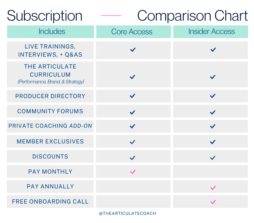 Need hands-on guidance? Add 1:1 coaching to your membership and receive customized support with your performances, materials, and strategic goals.